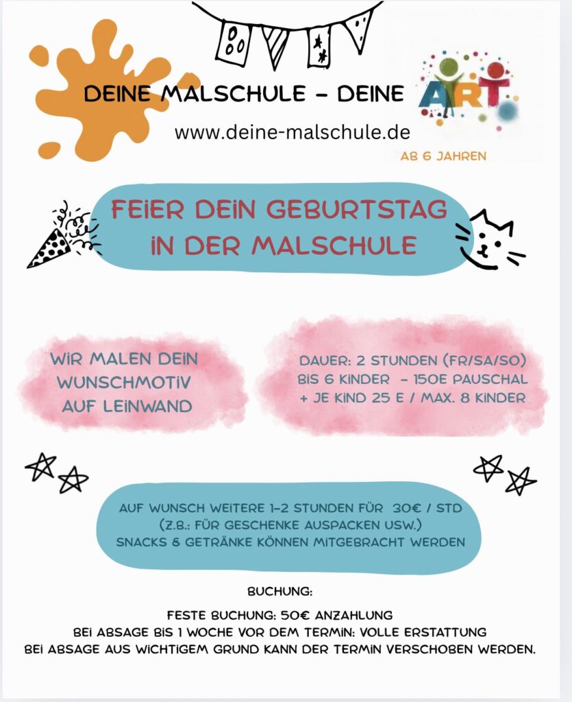 Deine Malschule – deine art Geburtstag Anzahlung (50€) per PayPal an info@deine-malschule.de Geburtstag anfragen Folge uns auf Instagram Instagram